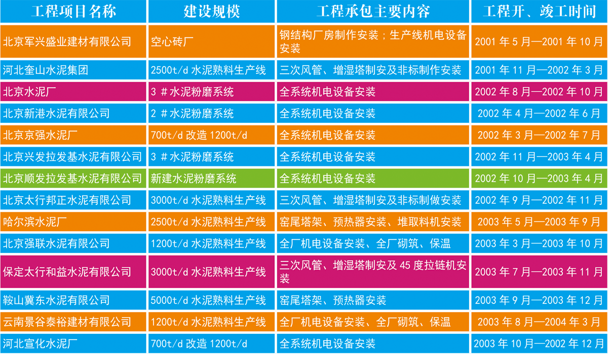 我公司每年為十幾個(gè)水泥廠提供大修改造服務(wù),主要內(nèi)容有∶ 窯系統(tǒng)換民,預(yù)熱器更換澆筑料窯托輪更換軸承瓦,更換窯口鐵,更換筒體; 磨機(jī)更換襯板,銅壓機(jī)更換銀套,立磨更換襯板及輾套; 破碎機(jī)更換襯板及錘頭,堆取料機(jī)更換鏈條及刮板; 全廠電機(jī)檢查,其他附機(jī)設(shè)備檢修; 其他甲方要求的項(xiàng)目。